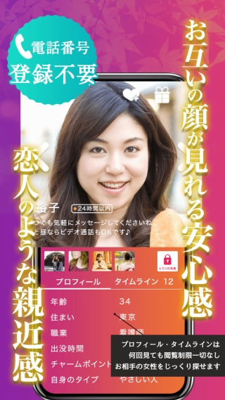 アプリなので電話番号登録せずインストールできます。通話よりメッセメインで人妻熟女とコミュニケーションをとりたいかたにもお勧めです。