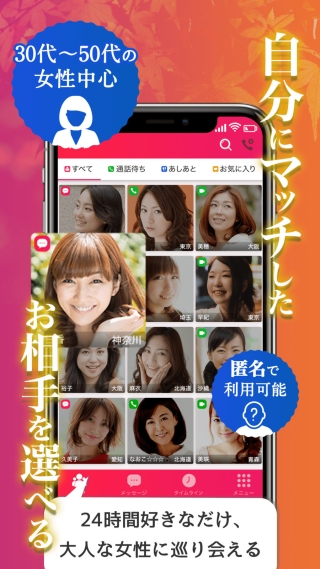 30代から50代の人生経験豊富な女性達といつでも好きな時に繋がる事ができます。
