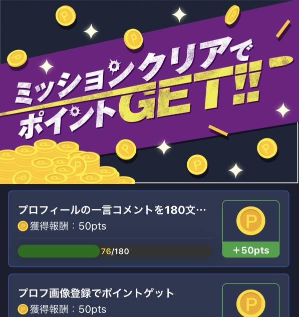 自己プロフィールの充実やお気に入り追加等で無料ポイントがもらえます!すぐに達成できるミッションも多いのでまずはミッションポイントを貯めよう!