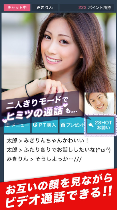 好みの女の子とお互いの表情を見せ合いながらの双方向ビデオ通話は最高に幸せです。未経験のかたはぜひ一度体験して下さい。胸がドキドキすることうけあいです!